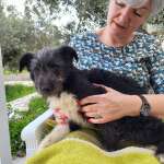 Anastasia was returning to her house when she noticed one of these little guys by the side of the road, just outside a fenced property. She immediately stopped and got out of her car, but there were 3 puppies and a tiny mother.